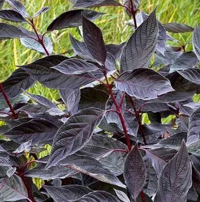 Дерен белый Nightfall (Сумерки). Cornus alba Nightfall. Новый сорт белого дерена с необычным для дерна листьями фиолетового цвета. Дёрен белый Найтфолл — элегантный контраст для вашего сада Cornus alba 'Nightfall' — декоративный листопадный кустарник, который привлекает внимание в любое время года. Его главная изюминка — тёмная, почти чёрная листва, создающая яркий контраст с красными побегами. Осенью листья приобретают насыщенный пурпурный оттенок, делая куст особенно эффектным. Весной появляются кремово-белые цветы, а ближе к осени — декоративные белые ягоды, привлекающие птиц. Отличается более вертикальным ростом, чем другие сорта белого дерена. Весной его листья темно-зеленые, в течение сезона темнеют до глубоко темно-фиолетовой окраски. Листья с нижней стороны имеют серую бархатистую дымку, которая красиво контрастирует с темным растением. Красные ветки зимой делают Cornus Nightfall привлекательным не только в вегетационный период, но и в холодное время года.