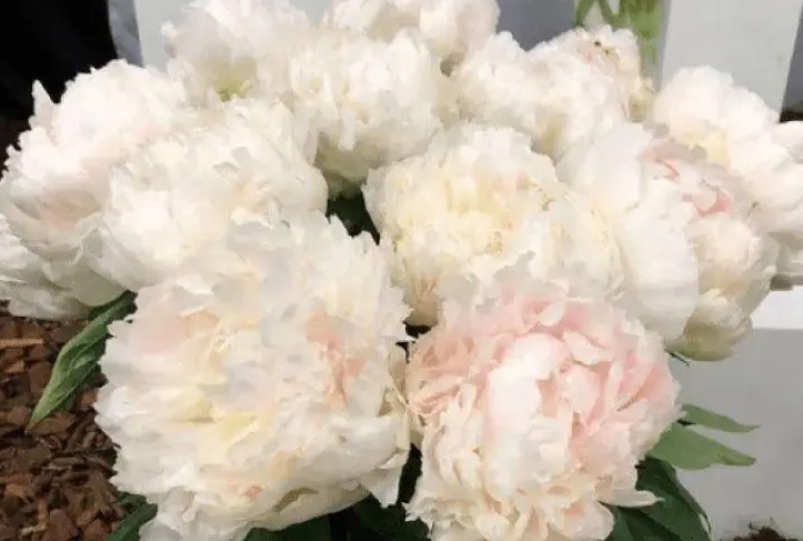 Махровый розовидный пион средне-раннего срока цветения. Листва этого пиона плотная и темно-зеленая, а стебли достаточно крепкие, чтобы гордо и прямо удерживать огромные цветки, белые с легким румянцем.