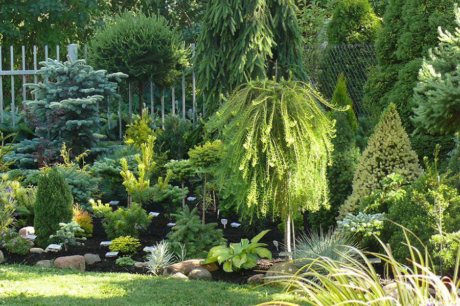 Очень живописно выглядят в саду разнообразнейшие “шарики” из многочисленных карликовых сортов елей, сосен или пихт.