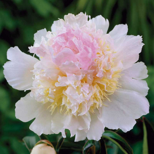 Махровый. Цветок необычной формы, диаметром 18 см, переливчатый – наружные лепестки розоватые, затем корона из ярко-жёлтых коротких петалодий, центр – кремово-розовый.