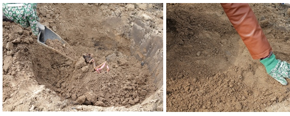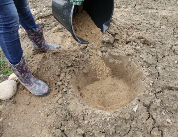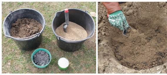 Засыпаем в яму половину выкопанной плодородной почвы, 1-2 ведра компоста или перегноя, 200 г суперфосфата и 300-400 г золы. Перемешиваем. Если почва глинистая, добавляем ведро песка или торфа, а если песчаная – ведро глины.
