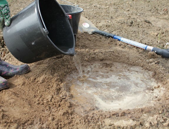 Делаем вокруг лунки валик из оставшейся почвы и обильно поливаем. Если грунт просел, подсыпаем еще земли.
