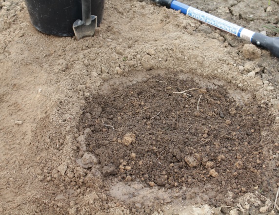 Сверху холмиком насыпаем оставшуюся плодородную почву, чтобы до краев ямы оставалось около 10-12 см.